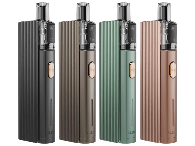 Neben dem beiliegenden 0,6 Ω GLENT Pod ist das System kompatibel mit der 1,0 Ω GLENT Cartridge (optional). Mit 0,6 Ω sind bis zu 19,8 W, mit 1,0 Ω bis zu 13,6 W möglich. Die Cartridge wird per Stecksystem sicher verbunden.