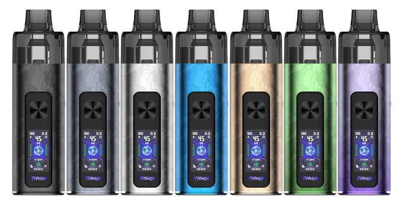 Der Typhos Akku liefert bis zu 45 Watt Leistung und ist mit einer 2 000 mAh starken Zelle ausgestattet. Zwei auswählbare Ausgabemodi bestimmen das Dampfverhalten: Storm sorgt für sofortige, kraftvolle Leistungsabgabe, während Waves eine pulsierende Intensität bietet. Auf dem 1,05″ HD-Farbdisplay werden alle wichtigen Parameter wie Leistung, Akkustand und Widerstand klar dargestellt.